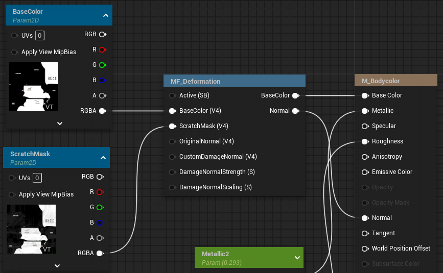 You can of course create a custom deformation material from scratch or extend an existing material instead of using the above template. You will have to evaluate the VertexColor's red channel which represents the current deformation of a given vertex. Here's a simple example of how to create scratches where deformation has taken place:
